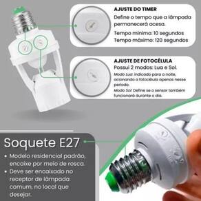 Com uma temperatura de trabalho que varia de -10ºC a 50ºC, o Soquete Sensor de Presença oferece uma regulagem de tempo de acionamento de 30, 60, 120, 240 ou 300 segundos, de acordo com a sua preferência. Além disso, é possível ajustar a sensibilidade do sensor, escolhendo entre as opções baixa, média ou alta.