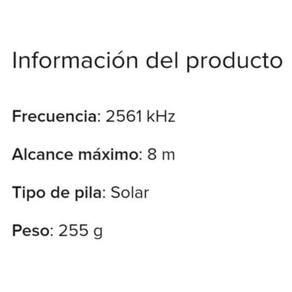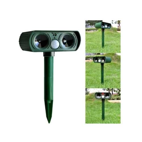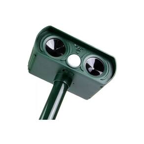 SOMOS MIKI IMPORTSFácil instalação, basta inserir a estaca no chão. É à prova de intempéries e permite trabalhar durante todo o ano e em quase todas as condições climáticas. Ele usa energia solar para recarregar as baterias, por isso está sempre funcionando. Especificações:\ N-Tipo: Sem luz intermitente/Com luz intermitente (opcional)\ N-Cor: verde escuro\ N-Material: Painel solar ABS: 5,5 V 0,11 W\ N Bateria recarregável: 4* 2/3AA 300mAh (incluída)\ N-Tempo de trabalho: 6-8 horas com carga total Distância efetiva: até 8M (dependendo do clima e do ambiente) -Ângulo de detecção: 110 graus (dependendo do clima e do ambiente) (clima ao redor) - Frequência ultrassônica: 25-61 kHz - Grau à prova d'água: IPX4 - Tamanho do produto: 14* 9,3* 37,5 cm - Peso do produto: 255g