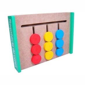 Sequência de Cores Planeta Brinquedos. Placa em mdf com 9 pinos fixos de madeira, 3 amarelos, 3 azuis e 3 vermelhos. O objetivo é agrupar as cores de acordo com a figura apresentada no livreto, ou definir uma sequência e repeti-la nos outros corredores, ou até mesmo embaralhar as cores, e depois organiza-las novamente. Acompanha livreto com 8 figuras de sequência de cores. Desenvolve raciocínio, paciência, estratégia, flexibilidade do pensamento. Devido a origem do produto ser artesanal podem ocorrer variações nas cores de acordo com o estoque do produto. Excelente acabamento. Idade: a partir de 4 anos. Certificação Inmetro: CE-BRI/ICEPEX-N 00174-82 NM300/2002.