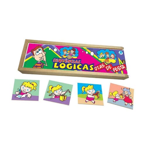 Sequencia Lógica. Dias de Festa - Simque. Sequencia Lógica estimula a criatividade da criança, buscando concentração e raciocínio do que acontece montando começo, meio e fim. Material: madeira Contem:16 peças 75x75x3 mm cada Embalagem: madeira 332x107x38 mm Faixa etária: a partir de 04 anos. Segurança CE-BRI/INNAC-0206-01 NBR NM 300/2002 Segurança do Brinquedo. Inmetro ATENÇÃO: Não recomendável para menores de 3 anos por conter partes pequenas que podem ser engolidas. Ean: 7898353142798