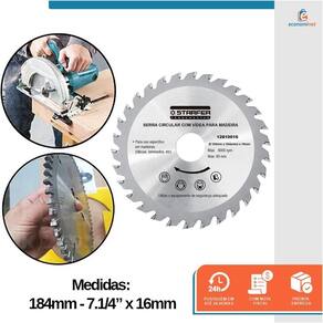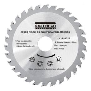 Especificações Técnicas: Material: Aço Carbono e Metal Duro Medidas: 184mm - 7.1/4 Número de dentes videa : 36 Diâmetro do furo: 16mm Limite máximo: 8000 rpm - 80 m/s Acompanha 2 buchas de redução Marca: Starfer Ref.: 12810016 Marca: Não Informado