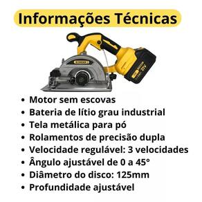 Serra Circular Elétrica Com 2 Baterias 21v Angular Pro Pode ser Utilizado no corte de azulejos, chapas, plástico, madeira e etc. A Serra Circular, conta com 3 velocidades diferentes e ângulo de trabalho ajustável até 45, além de punho auxiliar robusto, que proporciona maior estabilidade durante o corte. Informações Técnicas: Motor sem escovas Bateria de lítio grau industrial Tela metálica para pó Rolamentos de precisão dupla Velocidade regulável: 3 velocidades Ângulo ajustável de 0 a 45 Diâmetro do disco: 125mm Profundidade ajustável Itens Inclusos: 1x Serra Circular Portátil 21V 3x Lâminas de corte 1x Chave para Porca 1x Chave de Biela 1x Carregador 2x Bateria Marca: Não Informado Ean: 7908782201284
