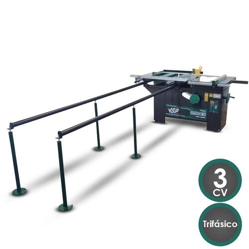 - Marca: Verry - Referência: VSP-2900I TR - Voltagem: 220/380V Trifásico - Potência instalada: 2,20 KW - Motor IP 21 - 3465 RPM: 2 polos 3 CV - Rotação da serra principal: 4200 rpm - Largura do corte da mesa fixa: 800 mm - Comprimento máximo de corte: 2900 mm - Diâmetro da serra: 250 mm - Diâmetro do eixo da serra: 30 mm - Ângulo de corte: 90° à 45° - Correia automotiva: 4PK 648 - Paralelo mesa fixa e móvel em alumínio - Eixos com rosca quadrada com trava de volante - Possui riscador: Não - Indicador do ângulo da serra: Analógico - Mesa móvel: 1030 x 770 mm - Mesa móvel estendida: 1030 x 1370 mm - Mesa Fixa: 600 x 720 mm - Dimensões da máquina: # Chassi: 1630 x 770 x 860 mm # Varões: 4200 x 100 x 120 mm # 02 Volumes. - Peso líquido aproximado: 195kg