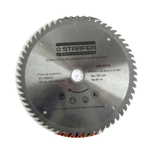 CARACTERÍSTICAS TÉCNICAS: Material: Aço carbono e metal duro Medidas: 200mm Número de dentes wídia : 60 Diâmetro do furo: 25,4mm Limite máximo: 7000 rpm - 80 m/s Espessura do disco: 2.2mm Espessura de corte: 3.2mm Marca: Starfer Ref.: 12810539 Ean: 7891638044855