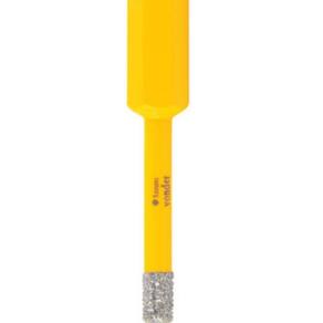 Possui corpo reforçado em aço, ponta com revestimento diamantado e haste sextavada