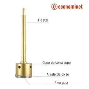 Serra copo contínua com lâmina diamantada. Corpo em aço carbono, acompanha haste e pino guia também em aço carbono.