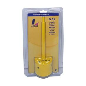 Serra copo diamantada, produzida em aço carbono, diamante sintético e pintura eletrostática amarela, Flex, super econômica, com broca piloto, encaixe de 9mm e haste de 17cm de comprimento. Ideal para fazer orifícios redondos em azulejo, cerâmica, granito, tijolo, entre outros. Cabo Extensível para Desempenadeira.