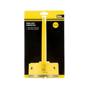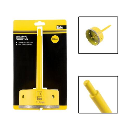 Especificações: - Marca: EDA; - Modelo: 0TP; - Material: Aço e Pó de Diamante; - Aplicação: Para o uso em esmerilhadeiras, indicado para vidro, cristal, cerâmica, azulejo e porcelanato; - Diâmetro: 100mm; - Comprimento da haste 170mm; - Diâmetro do encaixe da haste no mandril: 8,8mm; - Altura externa do copo: 47mm; - Altura da borda diamantada: 7mm; - Espessura do copo: 3,5mm; - Peso: 0,730 Kg;