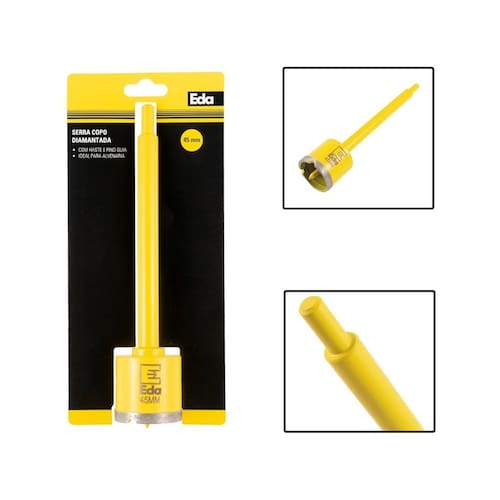Especificações: - Marca: EDA; - Modelo: 0TG; - Material: Aço e Pó de Diamante; - Aplicação: Para o uso em esmerilhadeiras, indicado para vidro, cristal, cerâmica, azulejo e porcelanato; - Diâmetro: 40mm; - Comprimento da haste 170mm; - Diâmetro do encaixe da haste no mandril: 8,8mm; - Altura externa do copo: 47mm; - Altura da borda diamantada: 7mm; - Espessura do copo: 3,5mm; - Peso: 0,373 Kg;