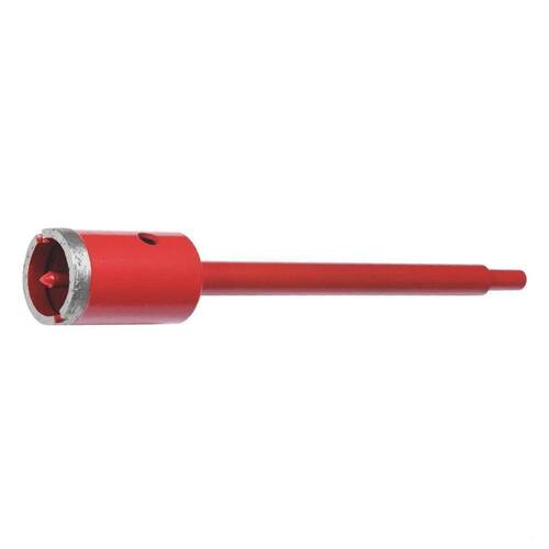 Serra copo diamantada com haste e pino guia - 45 mmDiâmetro do encaixe: 9 mm. Largura da aresta de corte: 7,5 mm. Comprimento da haste: 172 mm. Acabamento pintado. Utilizada com furadeiras elétricas. Nunca utilize no modo impacto. As serras copo com haste são utilizadas no trabalho de perfuração em concreto, tijolos, mármore, granito, refratários e azulejos.
