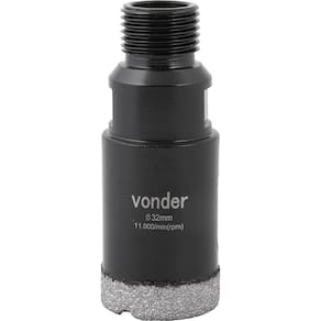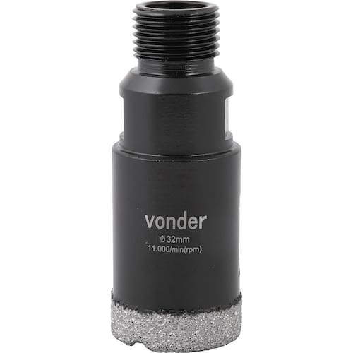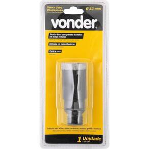 Ref. Fornecedor: 3617200032Marca: VonderConteúdo Embalagem:1 Serra copoDestaques e diferenciais:Corte a seco. Permite a realização de furos com grandes diâmetros em tempo reduzidoAplicações e dicas de uso:Serra copo diamantada para uso em telhas, tijolos, cerâmicas, azulejos, granito, mármore. Indicada para uso em esmerilhadeira com rosca interna M14 e rosca externa 1/2 BSP para máquinas estacionárias em marmorariaCaracterísticas Técnicas:Diâmetro da serra copo: 32 mm Altura útil aproximada da serra copo: 47 mm Comprimento total: 80,0 Diâmetro e tipo da rosca: M14 Rotação máxima rpm : 11000 /min Marca: Não Informado