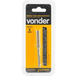 Descrição do Produto: Serra Copo Diamantada Refrigerada Com Haste 6mm Vonder 1 Serra copo diamantada refrigerada com haste Especialmente indicada para fazer furos corte refrigerado com água em porcelanato, cerâmica, granito e mármore. Rotação máxima rpm : 2.400/min. Possui corpo reforçado em aço, aresta de corte com revestimento diamantado e haste sextavada - Diâmetro da serra copo: 6 mm - Altura útil aproximada da serra copo: 35 mm - Altura da camada de diamante: 4,0 mm - Diâmetro da haste: 6,3 mm - Comprimento total da haste: 30 mm - Material da serra copo: Corpo em aço carbono e ponta diamantada Marca: Não Informado Ean: 7893946581688