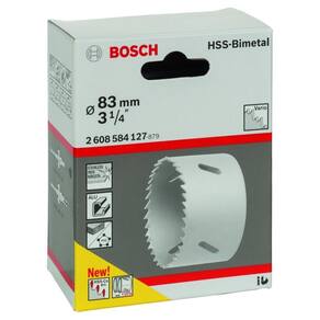Serra copo hss-bimetal 83mm bosch 2608584127 descrição: serra copo em bimetal hss com adição de cobalto para adaptador standard 83 mm, 3 1/4. Características: a serra copo em bimetal encaixa em todos os adaptadores standard no mercado, ela efetua o corte com rapidez em vários materiais. A configuração do dente tira de dente vario é ideal para deslizar através do material para fazer cortes rápidos e precisos. Feita de hss bimetal aço de corte rápido com 8% de liga de cobalto, esta serra copo apresenta um risco menor de quebra de dente e maior resistência ao calor para um corte de longa duração. Utilize esta serra copo ao cortar madeira, metal, inox e plásticos. Todos os nossos produtos são novos, e possuem do fabricante. Serra copo hss-bimetal 83mm 2608584127 bosch