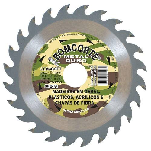 Indicação: Madeiras em geral, plásticos, acrílicos, chapas de fibra, sendo que, todos de baixa espessura. Características: Quantidade de dentes: 24 Diâmetro externo do disco: 110mm Diâmetro do furo: 20mm Espessura da chapa: 1,2mm Espessura da pastilha de metal duro: 2,0mm Profundidade máxima de corte máq. Serra Mármore : 34mm Comprimento máximo de corte linear, por vez: 200mm .