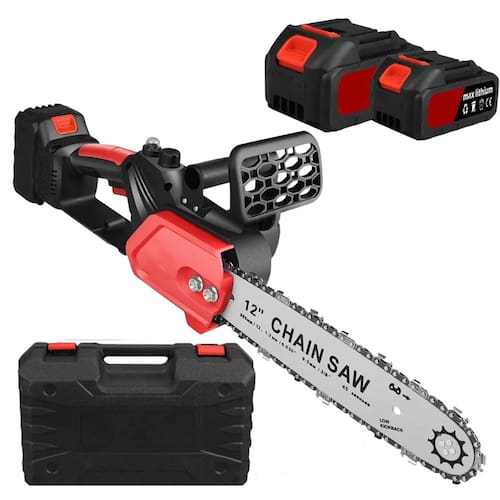 Equipada com sabre de 12" e duas baterias de longa duração, a motosserra é indispensável para qualquer pessoa que possua jardim, árvores, pomares,etc. e profissionais da jardinagem.