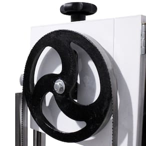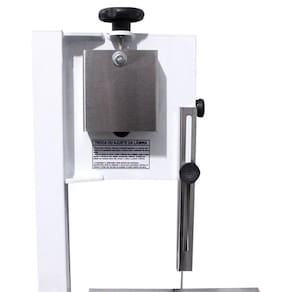 Serra Fita para uso doméstico ou pequenos negócios. Fabricada com estrutura e portas em chapa de Inox, coluna e suporte do esticador de aço carbono pintado eletrostaticamente e volante de ferro fundido.