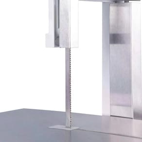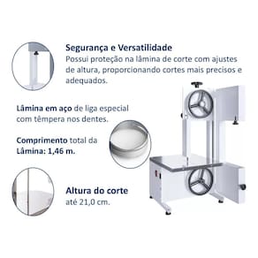 CARACTERÍSTICAS TÉCNICAS: Motor: 1/3 CV; Tipo: Monofásica; Voltagem: 110V ou 220V (chave seletora); Lâmina (fita estendida): 1.460 mm; Volantes: Ferro fundido; Mesa: Inox escovado; Altura útil de corte: 21 cm; Mesa fixa; Área útil da mesa: 32 x 36 cm (L x P); Estrutura com pintura epóxi branca; Protetor de lâmina.