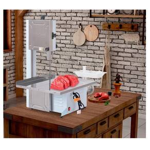 Aplicação: - Residêncial e comercial - Capaz de cortar grandes peças de carne com ossos além de possuir mecanismo para moer as mesmas - Sua serra possui 181 cm de comprimento e tem uma mesa fixa para apoiar a carne, sua capacidade de corte é de peças com 29,5 cm de altura e 20,5 cm de largura - Possibilita serrar carnes, aves e peixes, moer carnes e fazer embutidos