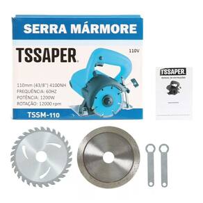 Serra mármore profissional 1200w 4.3/8 110mm + 2 discos A serra mármore possui motor potente de 1200w Pode se usar disco tradicional de até 4.3/8 110mm/5 para corte Disco facilmente encontrado em ferragistas Junto com a serra mármore acompanha uma chave e chave allen n 5 para fazer a troca do disco, 1 plug para água, 01 mangueira para água, 01 chave n 22 fixa, 01 manual de instrução Conta com uma estrutura compacta, leve e portátil. Pesando aproximadamente 3 kg Dados técnicos: Capacidade de corte: 32 mm Diâmetro do disco: 110 mm Diâmetro do disco: 110mm / 5polegadas Diâmetro do eixo: 20mm Potência: 1200 w Rotação máxima: 13.000 rpm Ângulo de corte: de 45º a 90º meia esquadria Cabo de energia : 2 m. Acompanha: - 1 discos de corte mármore - 1 discos de corte madeira - chaves para troca de discos - manual de instruções em português Uso indicado: cortar mármore, granito, concreto, alvenaria, telha, tijolo, ardósia e pedras em geral. Pode ser usada para madeira também, porém, o uso com disco de madeira é perigoso, deve-se sempre se atentar para a forma correta de manuseio.