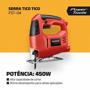 A Serra Tico-Tico FST-04 da Mondial é o item perfeito para quem deseja colocar a mão na massa e realizar seus projetos no melhor estilo “Faça Você Mesmo”. A ferramenta tem potência de 450W velocidade de 3.000 GPM e base ajustável em 0° 15° 30° e 45°. Além disso o protetor frontal da lâmina oferece mais segurança ao uso. Saiba mais sobre a FST-04: