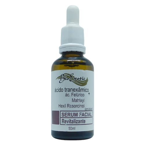 Serum ÁcidoTranexâmico + Ácido Ferúlico 50ml Bioexotic Ionizável Clareador da Pele e RejuvenescedorFormulação rica em componentes que conferem propriedades antioxidantes e revitalizantes , que hidratam e revigoram a pele. Anvisa Nº 25351.020877/2016-34 Propriedades gerais :Antirrugas, Clareador da Pele e Anti radicais Livres.Ativos:Ácido Tranexâmico : Redução das manchas escuras da pele.Ácido Ferúlico: Anti Oxidante e Anti Radicais Lvres.Hexlresorcinol: Clareador da pele. Matrixil : Renovação Celular e Antienvelhecimento.Indicação:Clareamento, revitalização e renovação celular para todos os tipos de peles.Modo de usar:Após a limpeza da pele,aplicar algumas gotas do serum, espalhando de maneira uniforme por toda a face.deixar absorver, protegendo a região dos olhos e da boca.Não há necessidade de retirar. Em caso de irritação , retirar com água Volume : 50ml