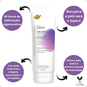 Desenvolvido com dermatologistas, este sérum corporal inovador usa ativos faciais para ajudar na autorreparação da pele. Além disso, é clinicamente comprovado na reparação e prevenção de cinco sinais de ressecamento. Sérum Corporal Hialurônico Dove com até 48 horas de hidratação regenerativa, recuperando a pele seca e áspera e proporcionando uma textura macia. Enriquecido com ácido hialurônico para uma pele macia, colágeno vegano para aumentar a hidratação e niacinamida e pró-lipídios para prevenir a perda de hidratação. Não testado em animais.