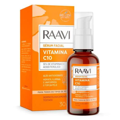 O Sérum Facial Raavi Vitamina C10 30g foi especialmente desenvolvida para proteger a pele contra os danos causados pelos radicais livres e melhorar a aparência geral da pele. Possui fórmula enriquecida com 10% de vitamina C e ácido ferúlico o que o torna uma opção eficaz para ajudar a iluminar e uniformizar o tom da pele, bem como para suavizar linhas finas e rugas. Além disso, a vitamina C ajuda a estimular a produção de colágeno na pele, o que pode ajudar a melhorar a firmeza e a elasticidade. Além disso, hidratada e promove uma pele mais saudável. O uso regular do sérum facial pode ajudar a melhorar a aparência geral da pele, deixando-a mais iluminada, firme e hidratada.