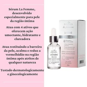 A estética íntima é a nova tendência do mercado e cada vez mais vem alcançando tanto o público feminino quanto o masculino. La Femme Sérum Íntimo é um produto com 4 com ativos poderosos que trabalham em sinergia com características umectantes, hidratantes, calmantes e clareadoras que atuam restituindo a barreira da pele, reduzindo a vermelhidão na região íntima após atritos de qualquer natureza.