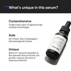Ciência por trás deste produto: os peptídeos são cadeias de aminoácidos que ajudam a acumular certas proteínas necessárias à pele, como colágeno, elastina e queratina. Estas proteínas da pele são naturalmente sintetizadas pelo nosso corpo e são responsáveis por manter a resiliência e firmeza da pele. No entanto, com o aumento da idade, a capacidade do nosso corpo de gerar essas proteínas (fatores de crescimento) diminui gradualmente e a ausência de substituição celular leva ao envelhecimento. Formulado com uma alta concentração de 7% de peptídeos Matrixyl 3000 que é testado para regular a expressão de Progerin, um marcador de senescência que se acumula com a idade. Suporta a ativação do processo de reparo cutâneo e, em particular, no nível da derme papilar frágil e propensa a danos UV, portanto, é um soro antienvelhecimento adequado e eficaz para todos os tipos de pele. O soro multipeptídeo Minimalist contém bioplacenta, obtida a partir de fermentação microbiana, que ajuda a sintetizar vários fatores de crescimento (muito semelhantes à placenta humana). A combinação de cinco fatores de crescimento e outros fatores essenciais na bio-placenta pode ter efeitos sinérgicos na pele e ajuda no rejuvenescimento da pele e revitalização celular. Também estimula o crescimento celular e promove a biossíntese de colágeno.