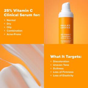 Este sérum de nível clínico possui 25% de vitamina C altamente estável para melhorar visivelmente o tom irregular, brilho, elasticidade e firmeza sem irritação. Este sérum leve é clinicamente comprovado para melhorar o tom irregular + descoloração enquanto aumenta o brilho e clareia o opaco. A fórmula pró-colágeno visivelmente firma e melhora a elasticidade, para que você obtenha resultados avançados — sem irritação. O soro clínico 25% de vitamina C + glutationa é formulado com uma mistura altamente estável de vitamina C solúvel em óleo e água para uma eficácia ideal. Glutationa + tecnologia patenteada GAP (precursores de aminoácidos de glutationa) trabalha para minimizar a irritação enquanto aumenta a proteção antioxidante e a estabilidade dos ingredientes. Esta fórmula de nível clínico ajuda a manter um nível natural de glutationa e vitamina C nas camadas mais superiores da pele para resultados prolongados, enquanto reduz o desconforto oxidativo que desencadeia a descoloração.