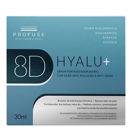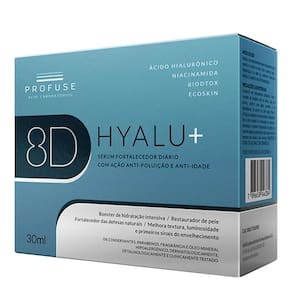 O que é e para que serve o Sérum Facial 8D Hyalu+? Profuse 8D Hyalu+ é um sérum fortalecedor diário que traz em sua formulação 8 diferentes tipos de ácido hialurônico, com alto poder hidratante, o ativo BioDtox com ação antipoluição, combatendo a oxidação gerada pelos poluentes ambientais, o complexo Ecoskin com ação pré e pós biótica e a Niacinamida, ativo consagrado nos cuidados com a pele.