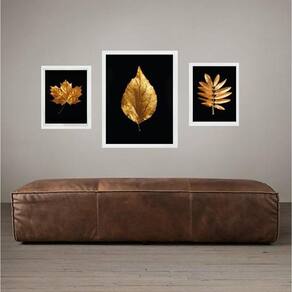 Set 3 quadros folhas - preto com dourado Cor: moldura branca Informações do produto tire todas as suas dúvidas no descritivo abaixo: decoração para quarto, sala, cozinha, escritório, área gourmet e muito mais. Chega de paredes vazias medidas - kit composto por 3 quadros, sendo 2 quadros com 24x33cm e 1 quadro com medida 33x45cm. Material do papel - papel fotográfico brilhante de altíssima resolução acabamento - todos os quadros são acompanhados de uma película de acetato para proteção da imagem. - os quadros são embalados de forma segura com plástico bolha com camada dupla de acordo com o tamanho dos quadros. Garantia - garantia de 3 meses. Meu quadro chegou. Como posso fixá-lo Você precisa apenas de um martelo e um prego, pois os quadros já vão acompanhados de penduradores. Esta é a forma mais indicada. Caso prefira, você pode utilizar uma fita dupla face neste caso, sugerimos de alta qualidade para evitar que descole e seu quadro caia . Como posso limpar meu quadro A limpeza é feita como um móvel comum da sua casa. Apenas um pano seco ou espanador são suficientes para tal