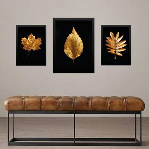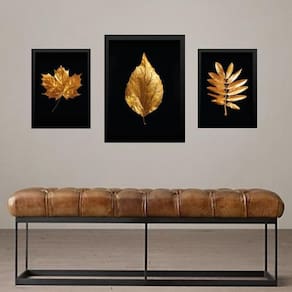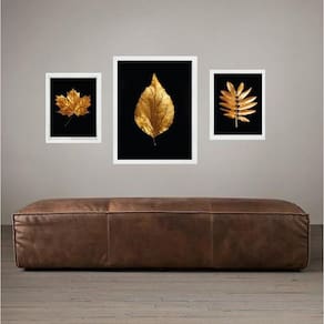 Set 3 quadros folhas - preto com dourado Cor: moldura branca Informações do produto tire todas as suas dúvidas no descritivo abaixo: decoração para quarto, sala, cozinha, escritório, área gourmet e muito mais. Chega de paredes vazias medidas - kit composto por 3 quadros, sendo 2 quadros com 24x33cm e 1 quadro com medida 33x45cm. Material do papel - papel fotográfico brilhante de altíssima resolução acabamento - todos os quadros são acompanhados de uma película de acetato para proteção da imagem. - os quadros são embalados de forma segura com plástico bolha com camada dupla de acordo com o tamanho dos quadros. - de 3 meses. Meu quadro chegou. Como posso fixá-lo Você precisa apenas de um martelo e um prego, pois os quadros já vão acompanhados de penduradores. Esta é a forma mais indicada. Caso prefira, você pode utilizar uma fita dupla face neste caso, sugerimos de alta qualidade para evitar que descole e seu quadro caia . Como posso limpar meu quadro A limpeza é feita como um móvel comum da sua casa. Apenas um pano seco ou espanador são suficientes para tal Ean: 7901494206707