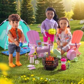Our Generation – Accesorios para Muñecas de 18 Pulgadas – Set de Camping – Tienda y Saco de Dormir – Juego de Simulación para Niños Mayores de 3 Años – Set de Campista Feliz - ¡Porque nos encanta la naturaleza! - Incluye: 1 tienda de tela, 1 saco de dormir, 1 palo con malvavisco y salchicha, 1 plato de camping, 1 taza de camping y 1 linterna no funcional - Muñeca y ropa se venden por separado