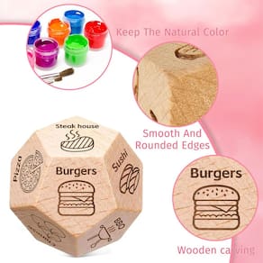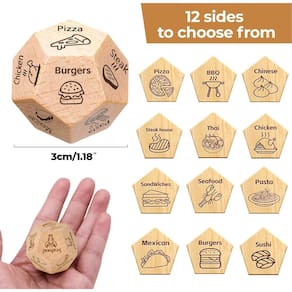 ¿Dificultad para decidir qué comer? ¡Deja que los dados elijan! Cada día es una sorpresa y la vida se vuelve más interesante. - ?Regalos para San Valentín para Él y Ella?Sorprende a tu ser querido con este set creativo que incluye un dado de comida. Perfecto para planear una noche romántica o romper la rutina del "¿Qué cenamos?" Solo lanza el dado y deja que el destino decida. Ideal para San Valentín, aniversarios o solo porque sí. Un regalo único para parejas, esposos, esposas, novios o novias. - ?12 Opciones de Comida para Parejas?Lanza el dado y descubre 12 deliciosas opciones: pizza, comida china, hamburguesas, sushi, bife, sándwiches, desayuno, comida mexicana, pollo, pasta, mariscos y ¡la carta comodín! Esto añade un giro divertido, haciendo de cada comida una aventura. Perfecto para canastas de Pascua, noches de juegos en pareja o como un relleno de media temporada para amantes de la comida. - ?Juego Interactivo y Divertido para Noches de Cita?¿Cansados de debatir siempre qué cenar? Nuestro dado para decidir la comida agrega emoción a tus noches de cita. Simplemente lánzalo y descubre deliciosas opciones que fomentan conversaciones divertidas. Un regalo práctico y gracioso para parejas, ideal para compromisos, bodas, cumpleaños, despedidas de soltera o incluso como un presente familiar lúdico. - ?Calidad Premium y Diseño Duradero?El dado de comida mide 4x4 cm, está elaborado en madera ligera y resistente con texto grabado con claridad. Su acabado natural mantiene la elegancia y el grabado profundo asegura legibilidad aún tras uso frecuente. Un regalo elegante y práctico para cualquier celebración. - ?Perfecto para Rellenos de Medias para Hombres, Mujeres y Adultos?Celebra momentos especiales con un regalo que sigue dando. Ideal para San Valentín, Halloween, Navidad o aniversarios. Este juego con dados genera risas y conexión. Ya sea para tu pareja, padres o amigos, es una manera única de crear recuerdos juntos.