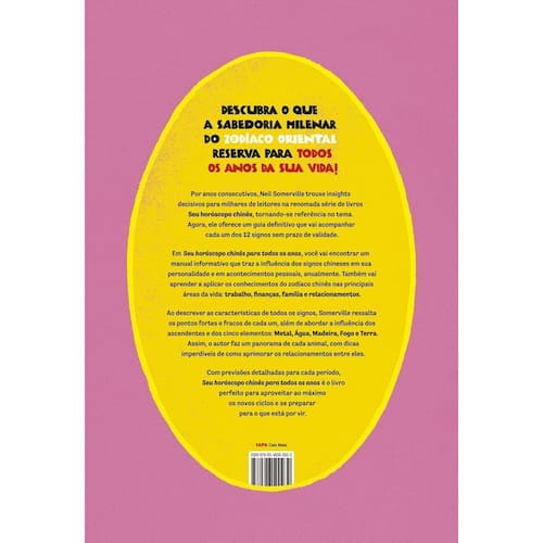 Descubra o que a milenar sabedoria do Zodíaco oriental reserva para todos os anos da sua vida! Em Seu horóscopo chinês para todos os anos Neil Somerville oferece insights sobre cada um dos signos chineses, além de dicas para ajudar os leitores a aproveitarem ao máximo o seu signo. Por muitos anos, Neil Somerville escreveu o anuário Seu horóscopo chinês e se tornou referência no tema pelos bons conselhos dados em seus livros, auxiliando milhares de pessoas em seu cotidiano. Agora, em Seu horóscopo chinês para todos os anos ele oferece um guia definitivo que vai acompanhar cada um dos 12 signos sem prazo de validade. Seu horóscopo chinês para todos os anos é um manual informativo que apresenta a sabedoria milenar da astrologia chinesa e o ensina a aplicá-la de maneira acessível. Neil Somerville oferece insights e dicas para potencializar as características mais marcantes do seu signo do zodíaco chinês, indica as tendências para cada ano, além de ajudar o leitor a aproveitar ao máximo os novos ciclos. Com previsões anuais detalhadas para cada um dos doze signos chineses, este guia contém seções dedicadas às áreas mais importantes da vida como trabalho, saúde, relacionamentos e finanças. Descreve, ainda, os traços de personalidade característicos de cada signo, ressaltando os pontos fortes e fracos e como aprimorá-los. E explica também como cada nativo é influenciado por um dos cinco elementos: Metal, Água, Madeira, Fogo e Terra. Seu horóscopo chinês para todos os anos é um guia indispensável a todos aqueles que desejam aproveitar da melhor maneira possível os anos que estão por vir.