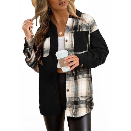 Astylish Blusa feminina de veludo cotelê color block manga comprida abotoada, Preto - Material: camisa de veludo cotelê astylish é feita com tecido de alta qualidade. Tecido de veludo cotelê super macio e leve para mulheres - Característica: tecido de veludo cotelê; bloco de cor xadrez; fecho de botão frontal; dois bolsos no busto; mangas compridas com punhos de botão; estilo namorado; gola virada para baixo; camisas folgadas - Combinado: esta camisa color block é fácil de combinar com uma variedade de regatas; cami; saias; jeans; shorts de cintura alta; sapatos de salto alto; colar e brincos; dando a você um visual atemporal e elegante - Ocasião: esta jaqueta xadrez de veludo cotelê é a escolha perfeita para o dia a dia; férias; viagens; ambiente de escritório ou trabalho; casa, encontros. É um presente ideal para amigas; mãe; esposa - Conteúdo da embalagem: uma camiseta feminina. Cuidados com a roupa: lavagem à mão recomendada, lavar à máquina com água fria, não usar alvejante