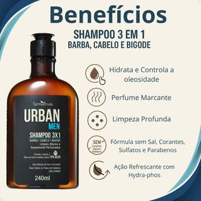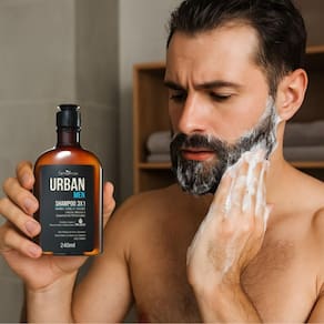 Aplique o Shampoo 3x1 Farmaervas Urban Men nos cabelos molhados, barba e bigode. Massageie com movimentos circulares até a limpeza total dos fios. Enxágue abundantemente. Se necessário, repita a aplicação para melhores resultados.