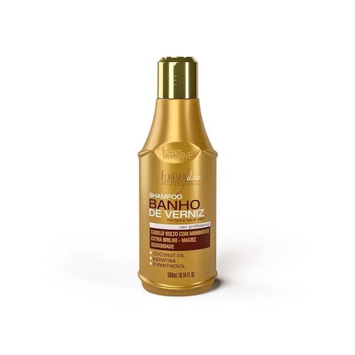 O Shampoo Banho de Verniz Forever Liss 300ml foi desenvolvido para limpar os seus cabelos enquanto fornece diversos nutrientes para os fios. Após remover a oleosidade excessiva dos fios e do couro cabeludo, ele prepara as cutículas capilares para receber diversos nutrientes que irão auxiliar na melhora da saúde e beleza dos cabelos. Seus princípios ativos são a Queratina hidrolisada, Óleo de Coco e D-Pantenol, que ajudam a devolver a vitalidade e brilho a todos os tipos de cabelos, sobretudo os danificados, ressecados e opacos. Dessa forma, traz de volta a maciez e a sedosidade, evitando o desbotamento e ressecamento dos cabelos. Para resultados ainda mais notáveis, é ideal utilizar todos os produtos da linha Banho de Verniz Forever Liss.
