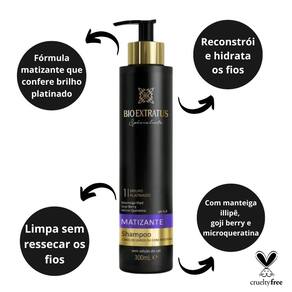 Fórmula matizante que confere brilho platinado, desde a primeira aplicação através do pigmento Acid Violet que retira o efeito amarelado e alaranjado dos fios. A ação antioxidante, reconstrutora e hidratante dos ativos naturais, promove um tratamento completo dos fios. Contém agentes de limpeza que atuam de forma eficiente, sem ressecar os fios. Para cabelos loiros ou com mechas. Com manteiga illipê, goji berry e microqueratina. pH 5,0. Sem adição de sal.