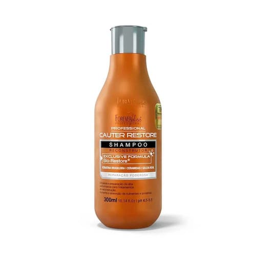 Shampoo Cauterização Cauter Restore Forever Liss 300ml para cabelos danificados e porosos. Com sua exclusiva fórmula Bio-Restore, Queratina Brasileira, Ceramidas e geleia real promove limpeza suave com preparação de alta performance, removendo impurezas e reestruturando toda a fibra capilar de forma intensa em cabelos ressecados e fragilizados por química. Promove reparação poderosa enquanto fortifica os seus fios tornando-os mais resistentes a danos futuros.