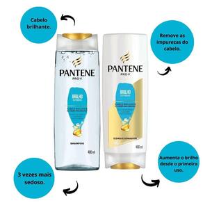 O Kit Pantene Brilho Extremo Shampoo 400 + Condicionador 175ml feita com extrato de pérolas, aloe vera e Pro-vitaminas, deixa seus cabelos mais brilhantes e sedosos. Remove impurezas e hidrata os fios deixando seu cabelo até três vezes mais sedoso, aumentando o brilho desde o primeiro uso.