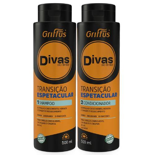O Kit é composto por: 1 Shampoo 500ml 1 Condicionador 500ml É hora de arrasar, diva! A linha Divas do Brasil Griffus foi criada para todos os tipos de curvaturas, atendendo às necessidades de diferentes os, com ativos que vão tratar e deixar os cabelos maravilhosos. Linha Vegana, ou seja: não testada em animais e livre de ingredientes de origem animal. O Shampoo Transição Espetacular Divas do Brasil Griffus possui uma fórmula enriquecida com extrato de bambu, Jaborandi e d-pantenol que auxilia na transição capilar dos os 2A a 4C. Esses ativos vão fortalecer os desde a raiz para crescerem fortes e saudáveis, contribuir para o crescimento acelerado e deixar os hidratados. *Sem cloreto de sódio.O Condicionador Transição Espetacular Divas do Brasil Griffus possui uma fórmula enriquecida com extrato de bambu, Jaborandi e d-pantenol que vai auxiliar na transição dos os 2A a 4C. Esses ativos vão fortalecer os desde a raiz para um crescimento acelerado. Além disso, os carão saudáveis, hidratados e com brilho.