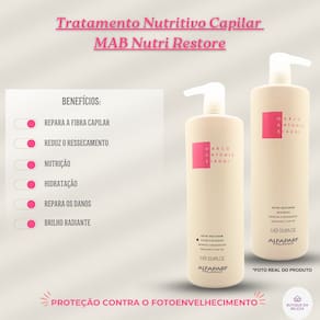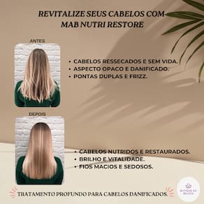 Para potencializar os resultados, utilize a linha completa MAB Nutri Restore, incluindo máscaras e finalizadores específicos.
