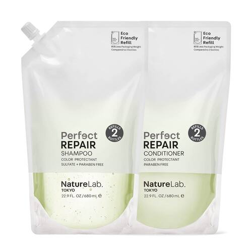 NatureLab Tokyo Perfect Repair Shampoo: Bolsa de recarga ecológica: xampu reparador para reabastecer e restaurar cabelos danificados, tingidos e fortalecer novos cabelos I 680 ml. Condicionador NatureLab Tokyo Perfect Repair: Bolsa de recarga ecológica: Condicionador hidratante para reabastecer e restaurar cabelos danificados, tingidos e fortalecer novos cabelos I 680 ml