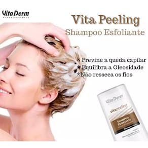 Vita Derm Vita Peeling Esfoliante Shampoo antirresíduo para todos os tipos de cabelo. vita Derm Vita Peeling Esfoliante higieniza profundamente os fios e o couro cabeludo, além de potencializar o resultado final dos demais tratamentos cosméticos capilares.