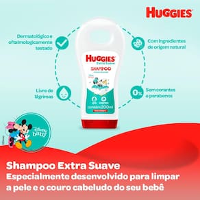 Leve qualidade e diversão ao banho do seu pequeno com o Shampoo Huggies! O Shampoo Huggies pertence a linha extra suave da Huggies e foi desenvolvido para limpar delicadamente o couro cabeludo e os cabelos do bebê, sem irritar os olhos nem a pele. Conta com uma fórmula exclusiva, testada dermatológica e oftalmologicamente, garantindo total segurança para o seu bebê.
