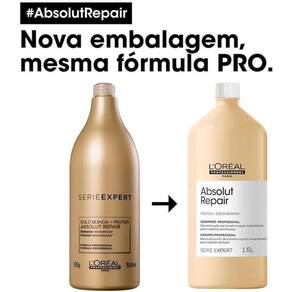 Shampoo para cabelos danificados. L'oréal Professionnel Serie Expert Absolut Repair Gold Quinoa + Protein Instant Resurfacing Shampoo reestrutura a fibra capilar, confere brilho e leveza durante a limpeza diária dos fios. O Shampoo Absolut Repair Gold Quinoa + Protein L'Oréal Professionnel traz ativos que ajudam restaurar a superfície dos fios para que o cabelo revele uma aparência mais saudável. Seu visual ganha muito mais brilho e um toque macio incrível. Ação Gino Quinoa e proteínas: reduz os danos na superfície do cabelo para fios mais brilhantes e com toque leve. Conselho de Aplicação Aplique o shampoo sobre o cabelo molhado e massageie com suavidade. Enxágue e, se necessário, repita o processo. Lembre-se se sempre colocar o shampoo na mão, e esfregá-lo nas suas palmas antes de passar no couro cabeludo. Isso evita com que o produto fique concentrado em apenas uma região do cabeludo. Resultado Seu cabelo fica limpo, até 77% mais reparado, 7x mais brilhante e com toque suave com o uso da linha completa . Marca: Não Informado