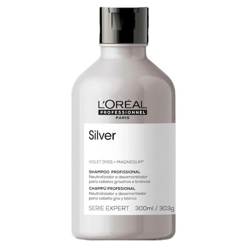 Shampoo para cabelos grisalhos, brancos ou loiros. L'oréal Professionnel Expert Silver neutraliza e elimina os reflexos amarelados dos fios. Para brilho e proteção da cor do cabelo.