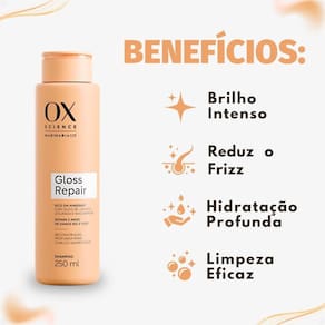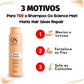 Shampoo Ox Science Mari Maria Hair Gloss Repair 250ml O Shampoo Ox Science Mari Maria Hair Gloss Repair 250ml limpa suavemente os fios enquanto inicia o tratamento reparador da linha Gloss Repair. Com tecnologia avançada e ativos poderosos como Óleo de Linhaça Dourada, Niacinamida e Algas Marinhas, ele atua desde a primeira lavagem para restaurar a fibra capilar, reduzir o frizz e devolver o brilho intenso e o toque macio aos cabelos. Desenvolvido pela parceria entre OX e Mari Maria Hair, o shampoo promove uma limpeza eficaz sem agredir os fios, deixando-os leves, soltos e com aspecto saudável.
